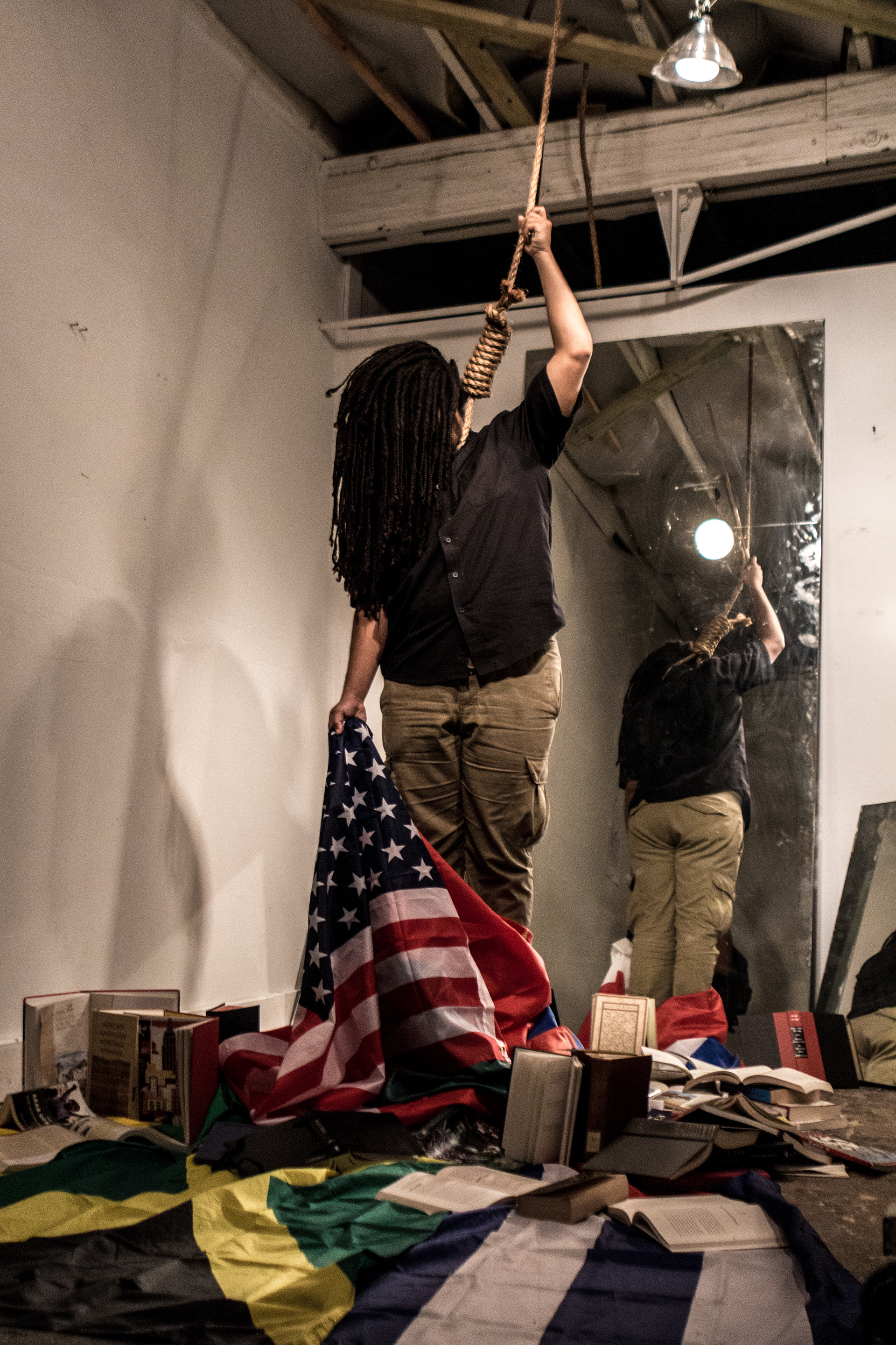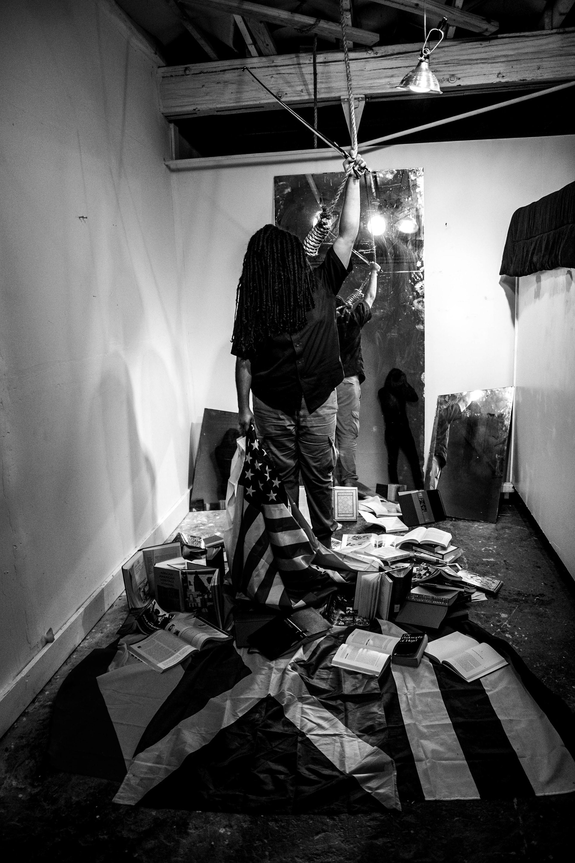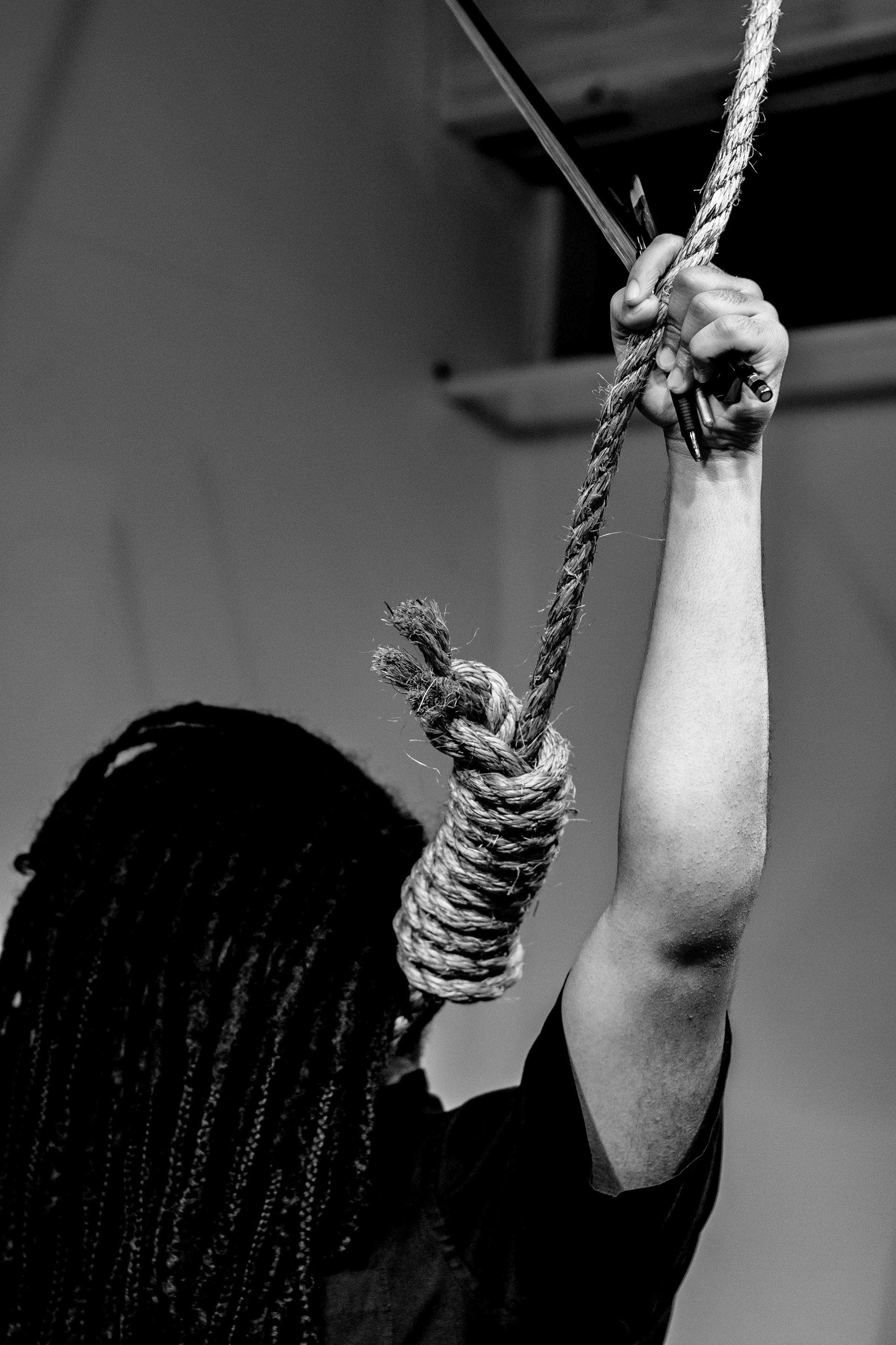 There are only two things stopping me from being completely consumed and erased by this noose: art and knowledge. For others, it is their faith, or knowledge of history, or decolonized way of thinking that saves them. Thus I am standing (precariously) on religious texts and history books. For many, it is art and music that keeps them up - but acknowledging how art is a servile occupation, in a way it encumbers me more (because at the end of the day, I as an artist am still a servant). This is why I’m holding myself up by gripping the rope - in addition to a pen, a brush, and the bow to my violin.