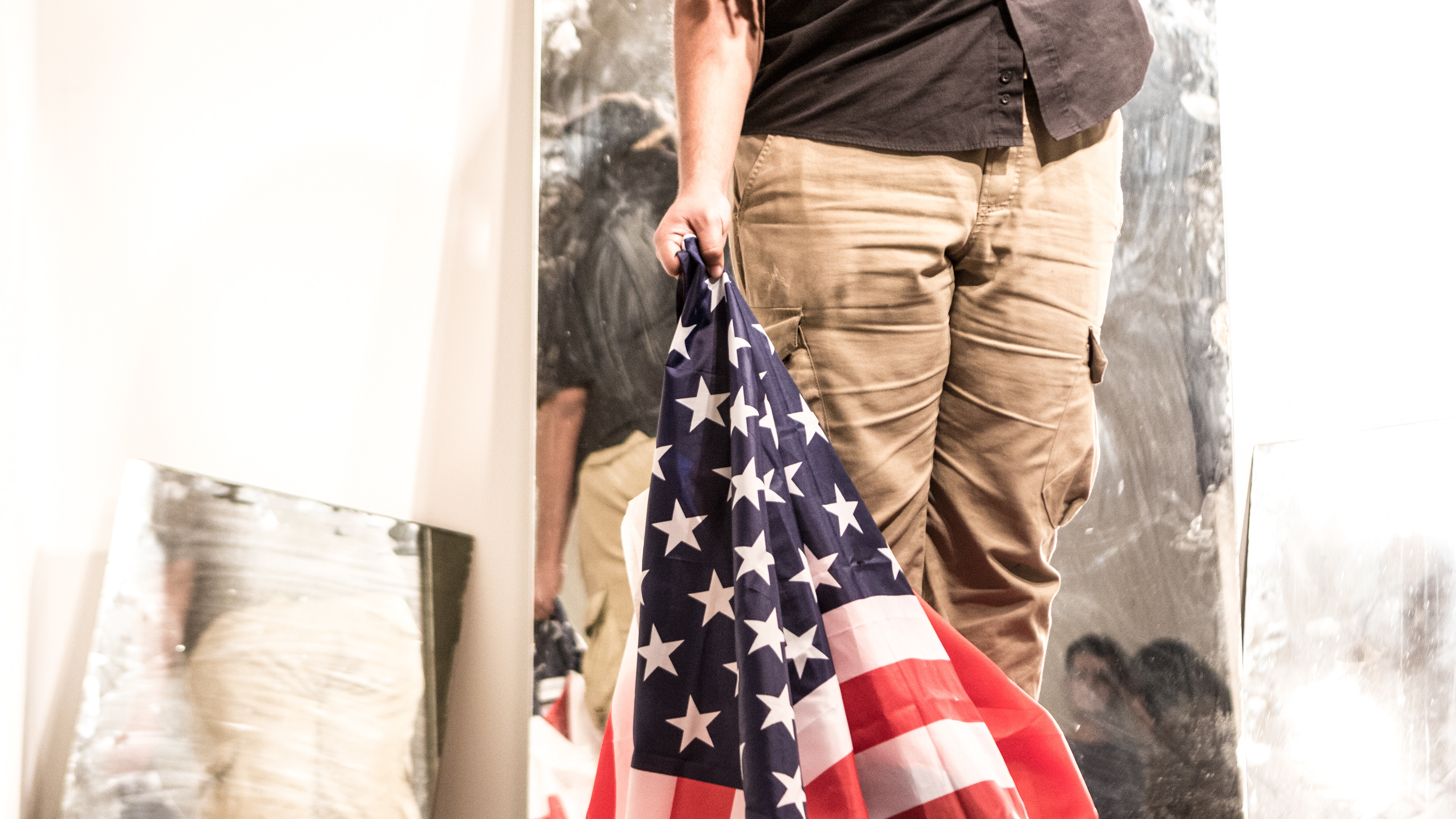 Through globalization America has expanded it’s hand and reached with force into the lives of other countries. Thus, I am holding a “quilt” of flags: flags of the African countries from which most slaves were taken, flags of countries with the most plantations, flags of those who built our country’s infrastructure, or were shunned to internment camps on our soil, flags of countries demonized by our government (despite those same countries being the origins of many american citizens).