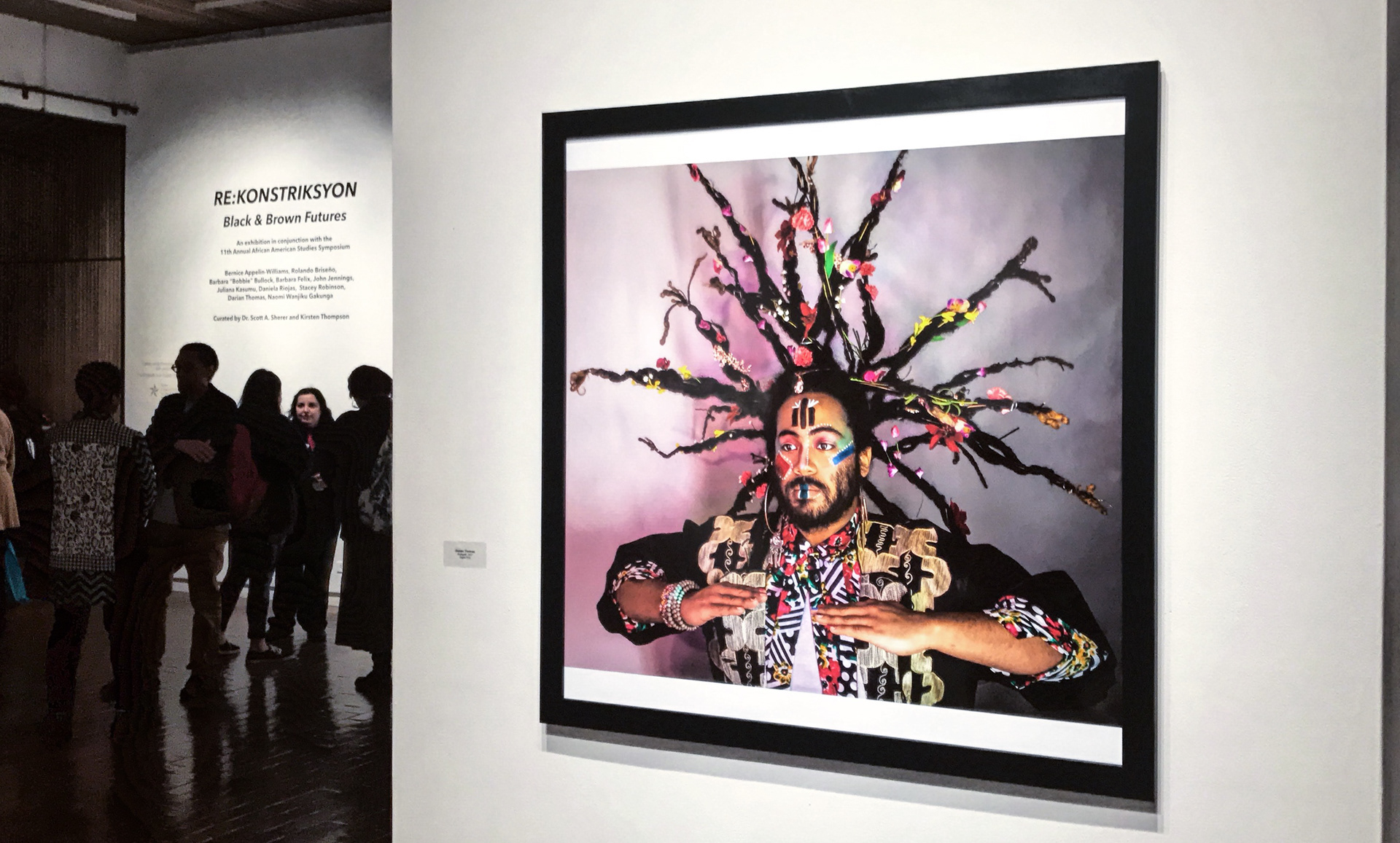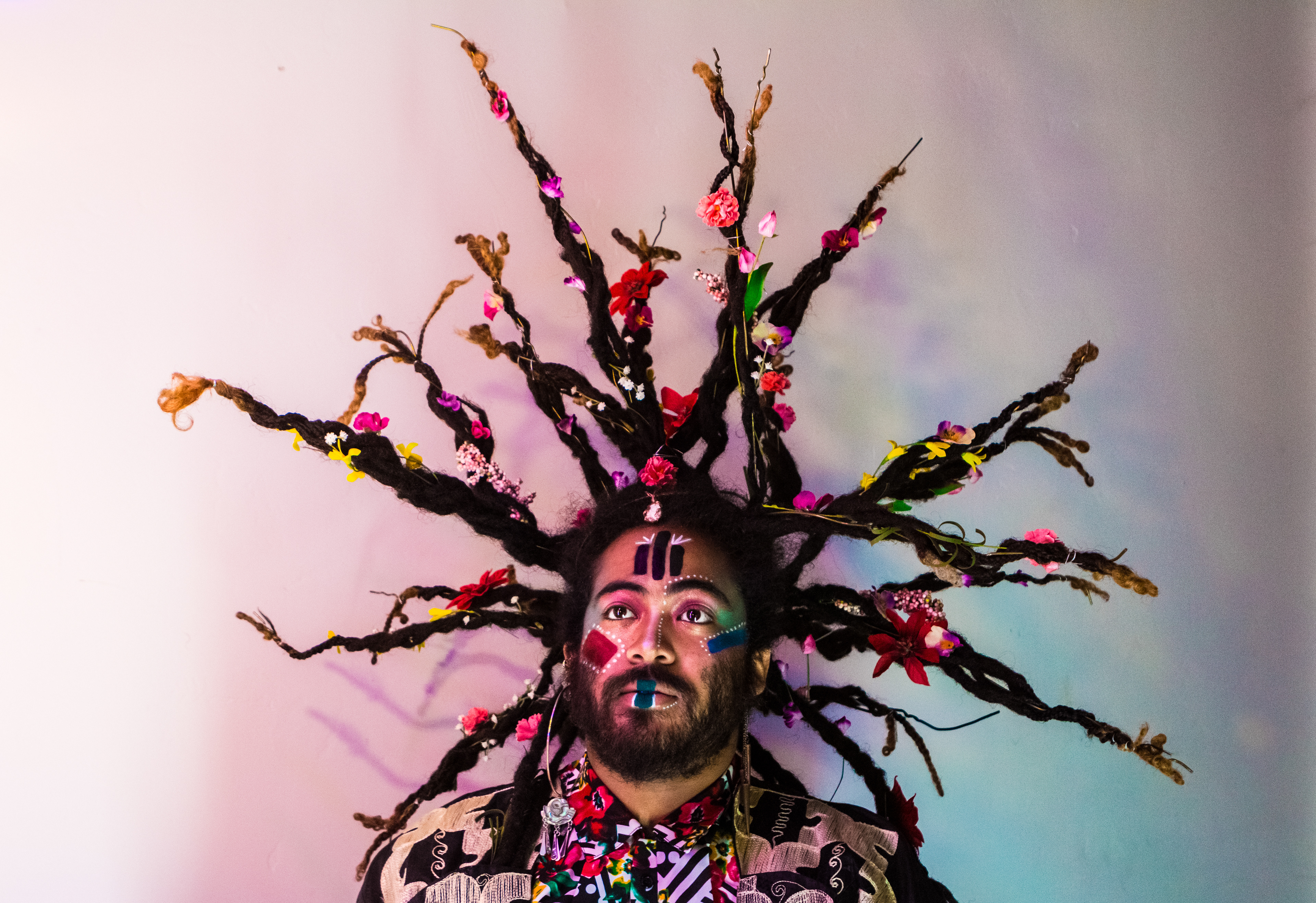 Regarding Afrofuturism: The makeup is created in an act of sankofa - an attempt to reach back towards my origins as a black individual who has had paths to my past erased through atrocities of history. I'm wearing non-traditional clothing to symbolize current styles of black young adults - which challenges gender norms and boldly mixes patterns. A piece from Ghana layered on a floral blouse both top a traditional white T-shirt and jeans.